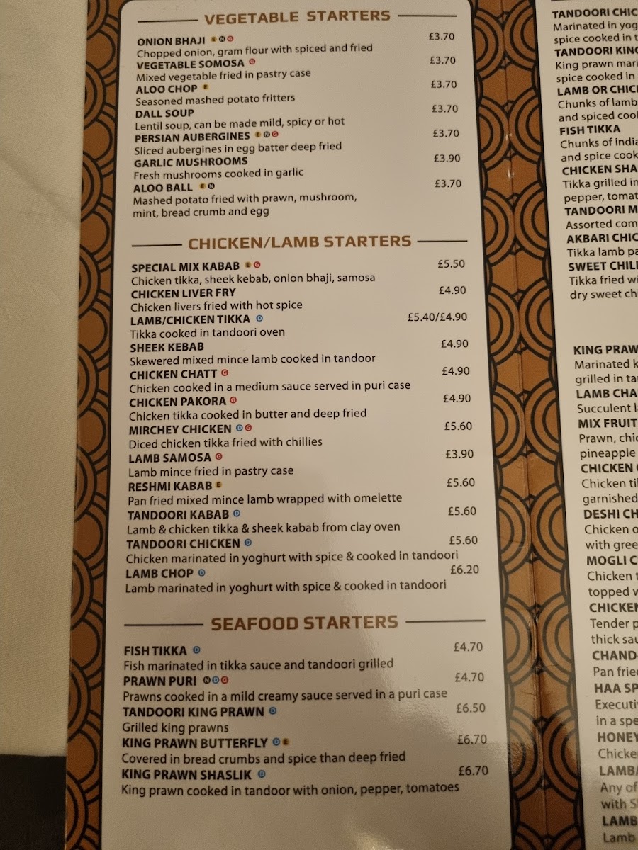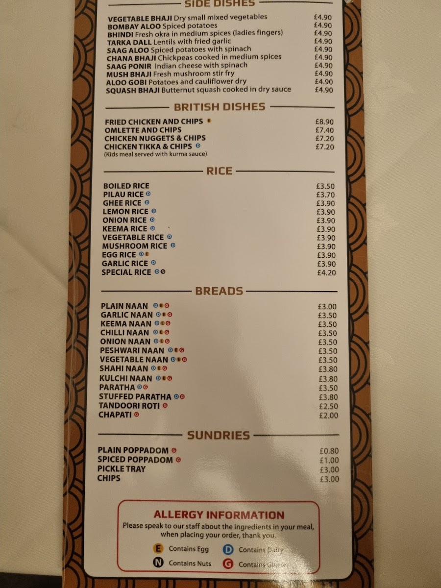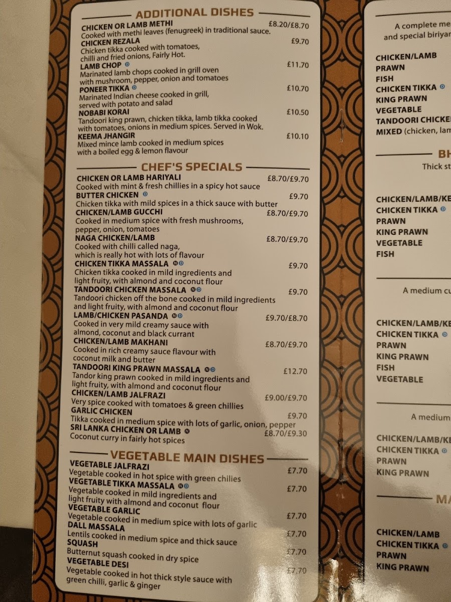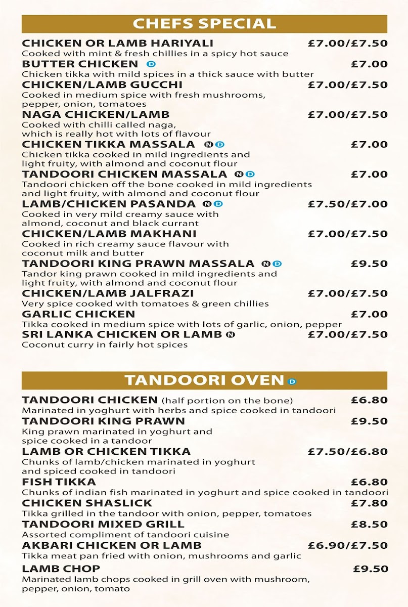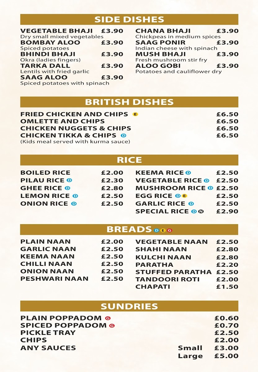 Side Dishes British Dishes Rice Breads Sundries Additional Dishes Chef's Specials Vegetable Main Dishes Tandoori Oven D Biryani Methi Egg Mosalla Balti Bangladesh Dishes Executive Chef Recommendation Bhuna / Dopiaza Dansak Saag Kurma Vindaloo Rogan Josh Vegetarian Starters Meat Starters Seafood Starters Others